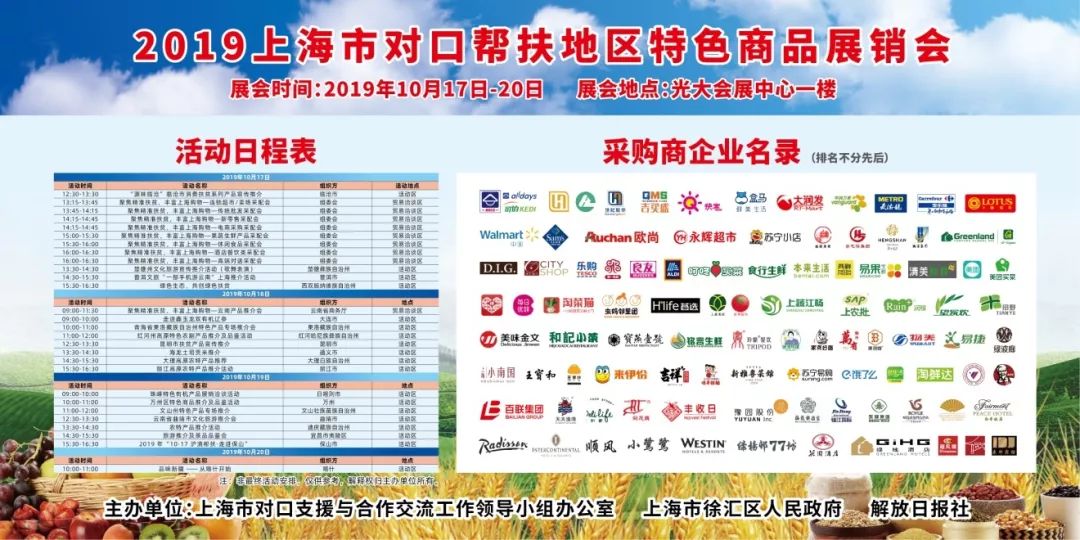 2019上海市对口地区特色商品展销会由上海市对口支援与合作交流工作领导小组办公室、上海市徐汇区人民政府、解放日报社联合主办。集中展示了来自上海对口的云南、青海、西藏、新疆、重庆等8省(区、市)的21个市(地、州)的数千种工艺品和美食。