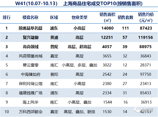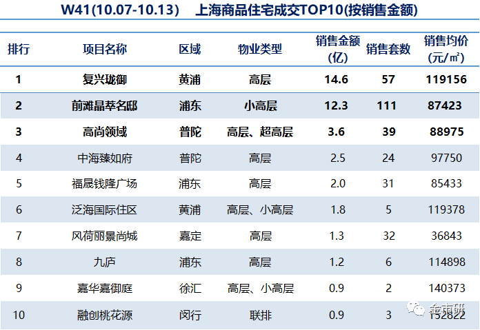 本周上海住宅成交TOP10,销售面积榜首为前滩晶萃名邸,销售金额榜首为复兴珑御