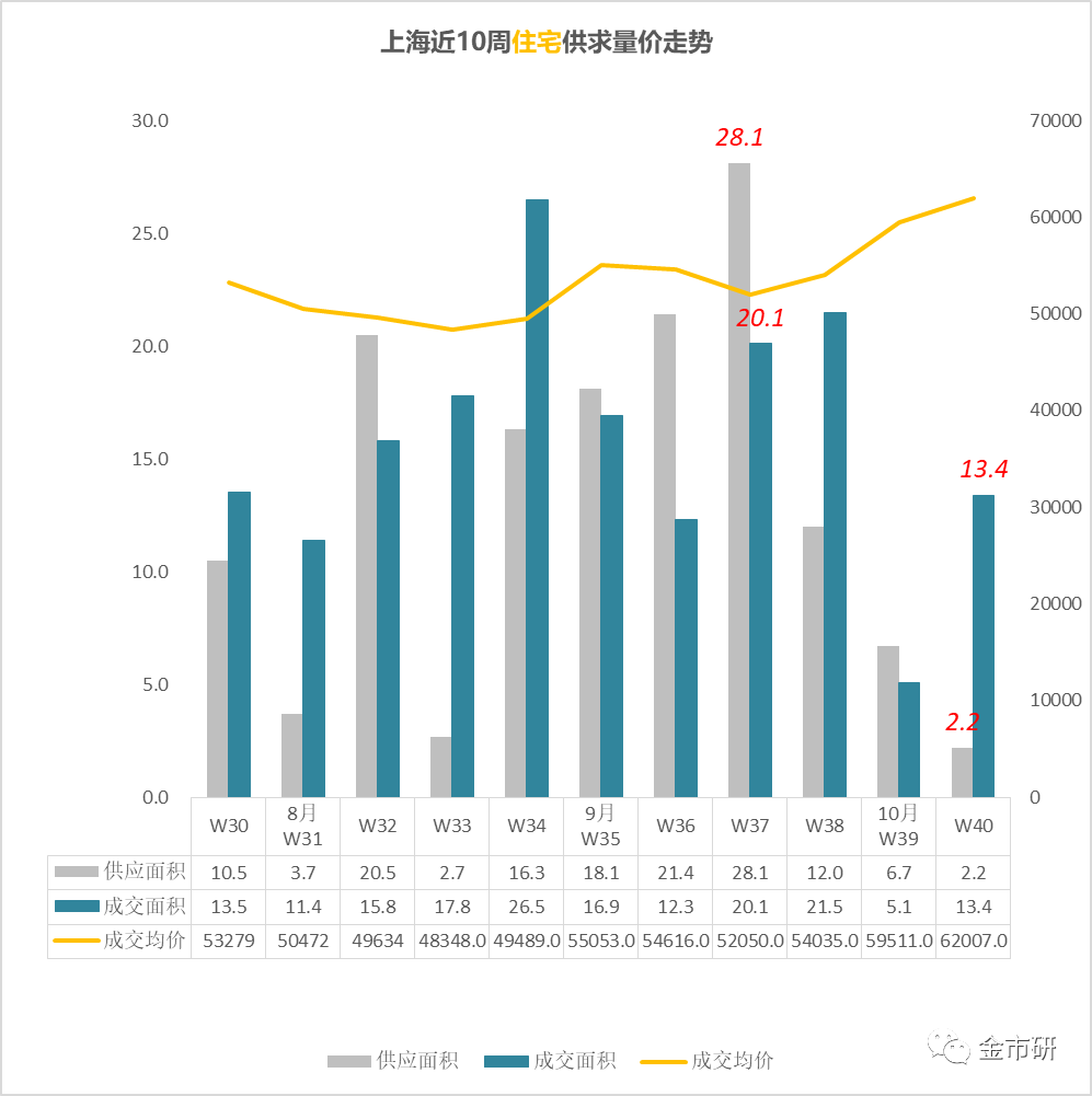 2019年第40周(10.07-10.13)上海商品住宅共供应2.2万方,成交13.4万方(1091套),成交均价59511元/㎡。