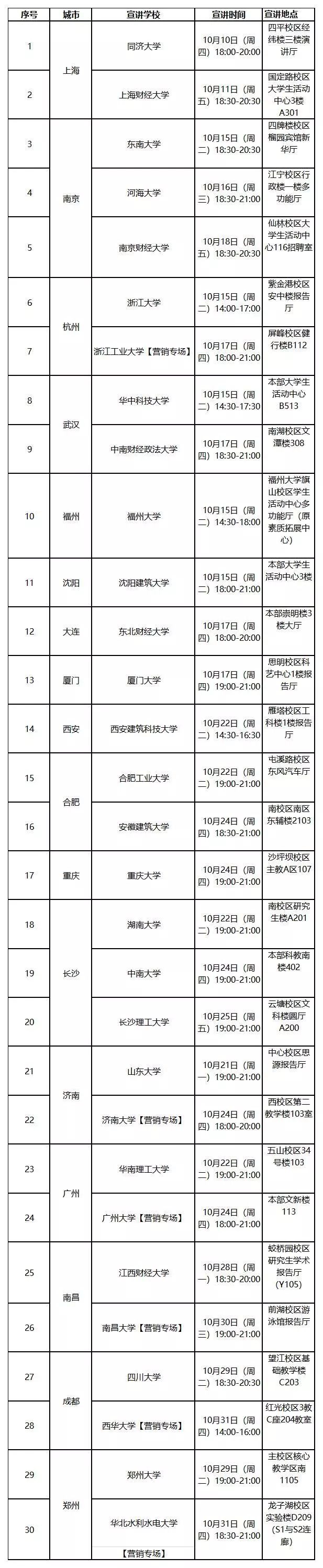 网申—校园宣讲—面试—发放录取通知(注:录取后将进行实习安排和为期二年的培养计划,具体以后续通知为准。)宣讲会行程表: