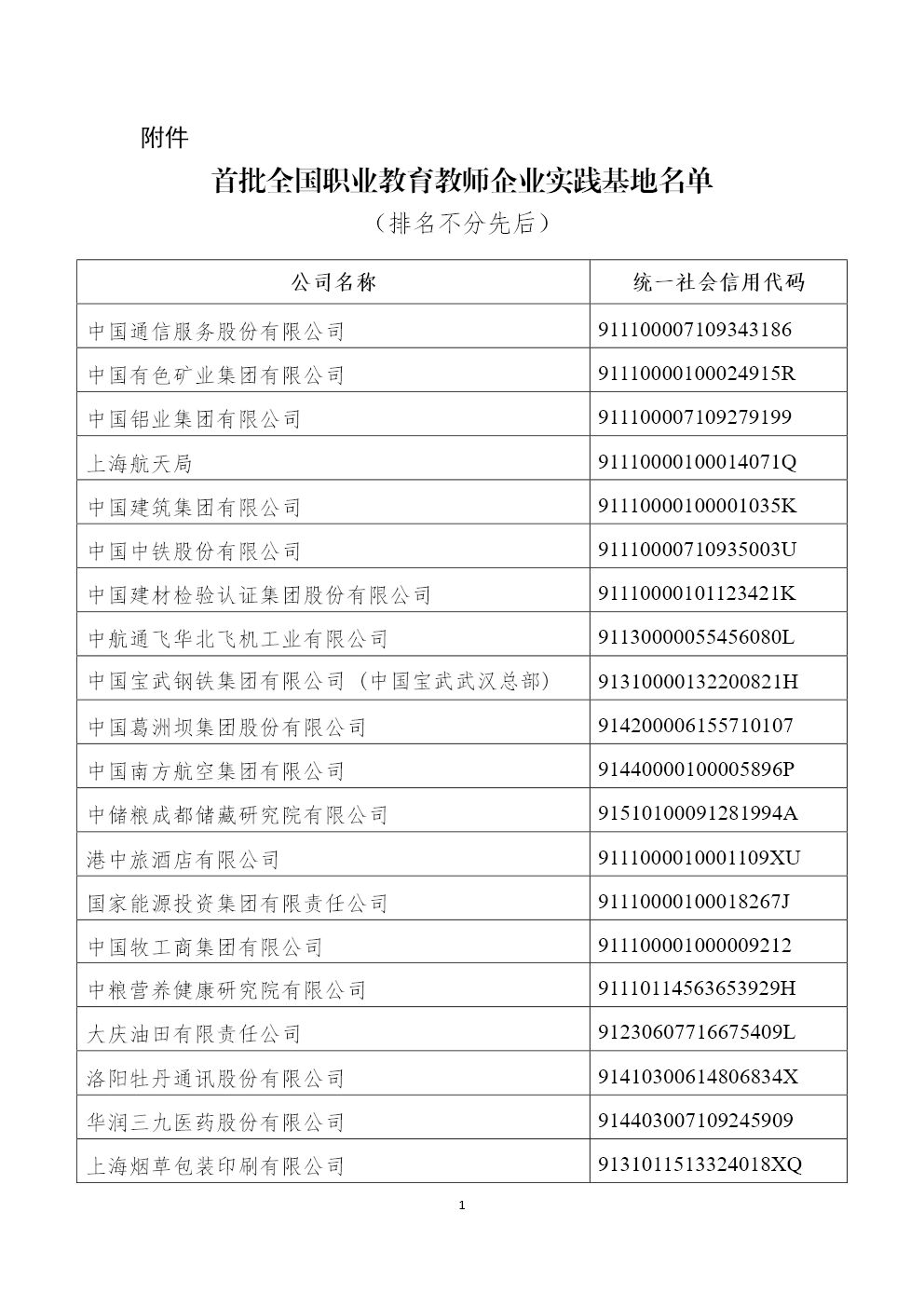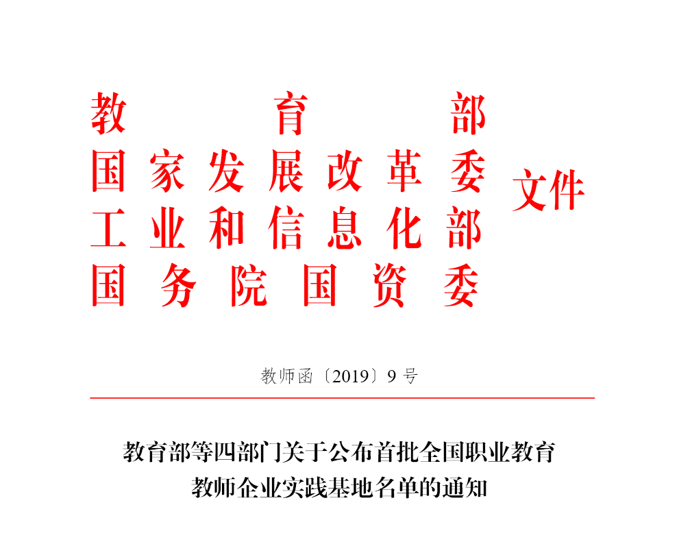 为贯彻落实《中共中央 国务院关于全面深化新时代教师队伍建设改革的意见》精神,按照《国家职业教育改革实施方案》工作部署,根据《教育部等七部门关于印发〈职业学校教师企业实践规定〉的通知》要求,深化产教融合、校企合作,发挥企业在职教师资队伍建设中的重要作用,加快建设一支新时代高素质“双师型”教师队伍,经有关行业主管部门、行业组织及各省(区、市)推荐,教育部等部门组织专家遴选,确定中国通信服务股份有限公司等企业为首批全国职业教育教师企业实践基地(名单见附件),现予以公布,并就有关事宜通知如下。