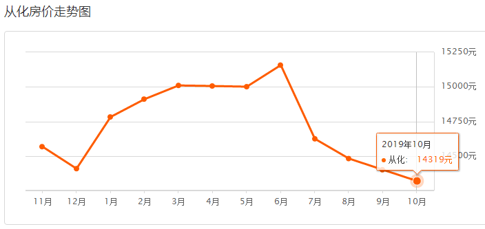 从化10月二手房均价 14319 元/m?从化9月二手房均价 14400 元/m?环比上月下跌 0.56% ↓同比去年同期下跌 3.45% ↓