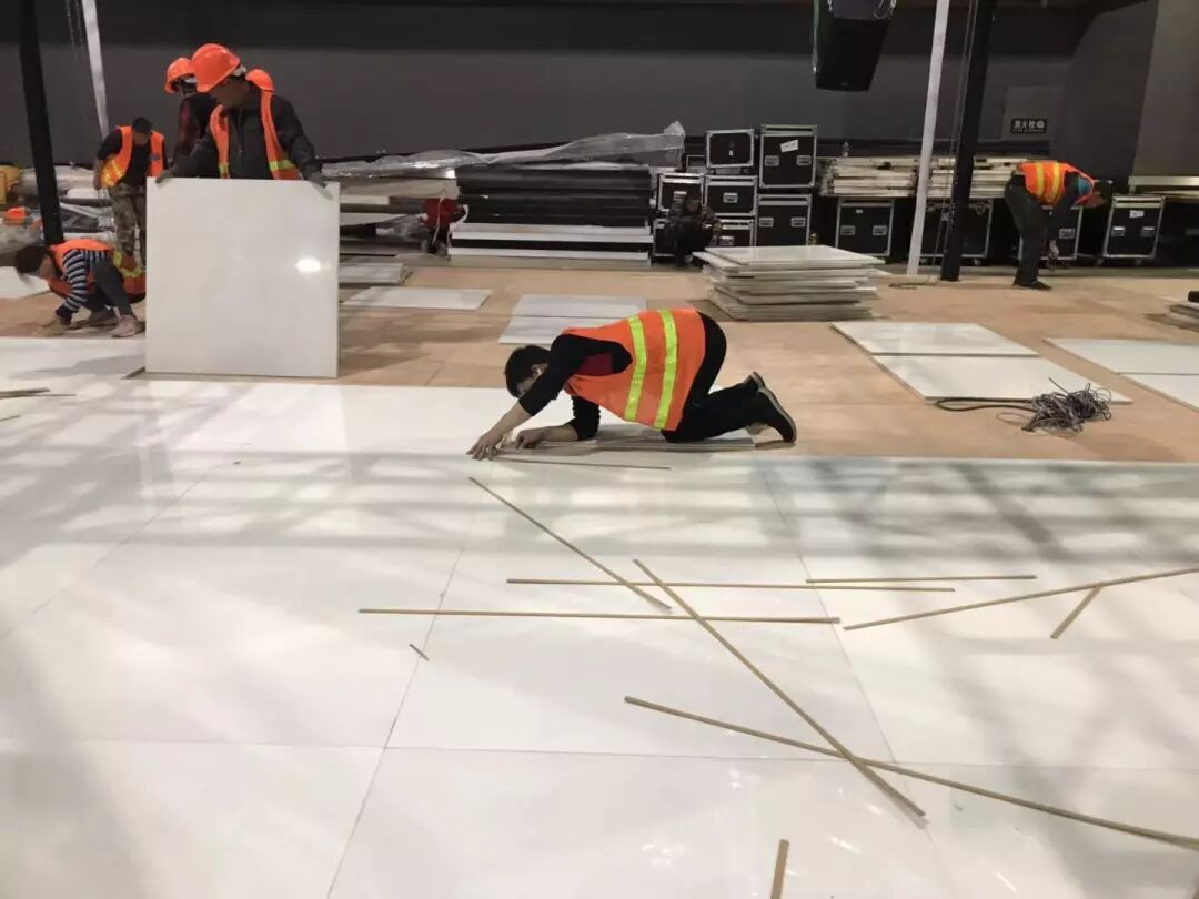 地台面覆淋油板,增强视觉效果,工人尽力追求着无缝对接,灯光位置反复进行调试,门头发光字配合彩色滚动霓虹灯条使整个展位更具科技感。