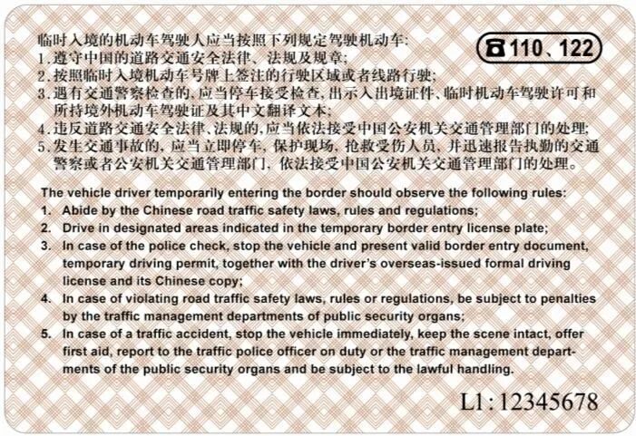 红色;“姓名”、“性别”、“国籍”、“在中国许可驾驶的车型”、“有效期限”字体为8pt宋体;“注”及其后中文字体为7pt宋体,颜色为黑色。英文“Temporary Driving Permit”字体为7pt Arial字体;“Name”、“Sex”、“Nationality”、“Class of Vehicle Operated in China”、“Valid Period”字体为6pt Times New Roman字体;“注”之后的英文字体为5pt Arial粗体。