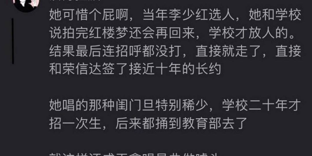 9月23日,网曝当初李少红亲自去学校挑的人,李沁还向学校保证拍完了就回学校继续读书,学校这才放心让李沁去拍戏的。没想到李沁没有和学校打招呼就直接和李少红公司签了十年的合约。而李沁就读的昆曲学校二十年才招一次生,李沁的不辞而别也被学校闹到教育局了。