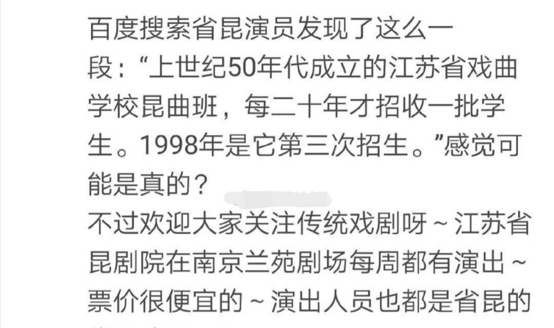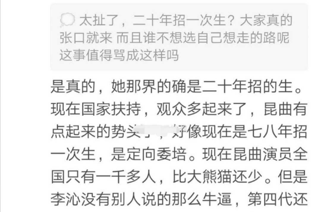 有些关注戏曲界的网友也出来说明,由于戏剧行业这些年人才凋零,早年就是二十年招一次生,只是现在才是7-8年招一次生。还好现在国家扶持,昆曲的受众面逐渐多了起来,不过昆曲行业现在全国也就一千多人,真的是比大熊猫都少。
