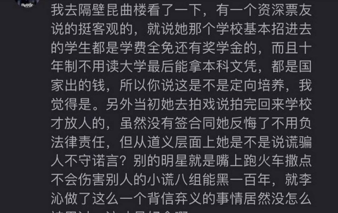 网友还爆料称李沁就读的昆曲学校属于定向培养,学费全免还有奖学金拿,这些都是国家出的钱,十年制不用读大学拿本科文凭,这些条件可见国家对昆曲演员的重视,这也是昆曲行业培养一位戏剧人才为什么需要花费十几年的心力。不过有网友质疑昆曲要培养二十年?