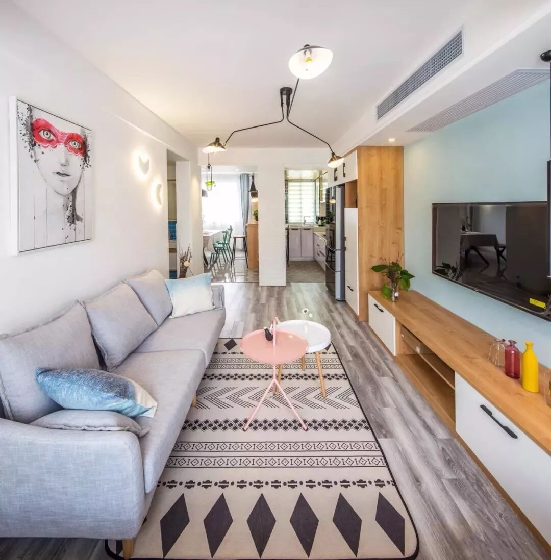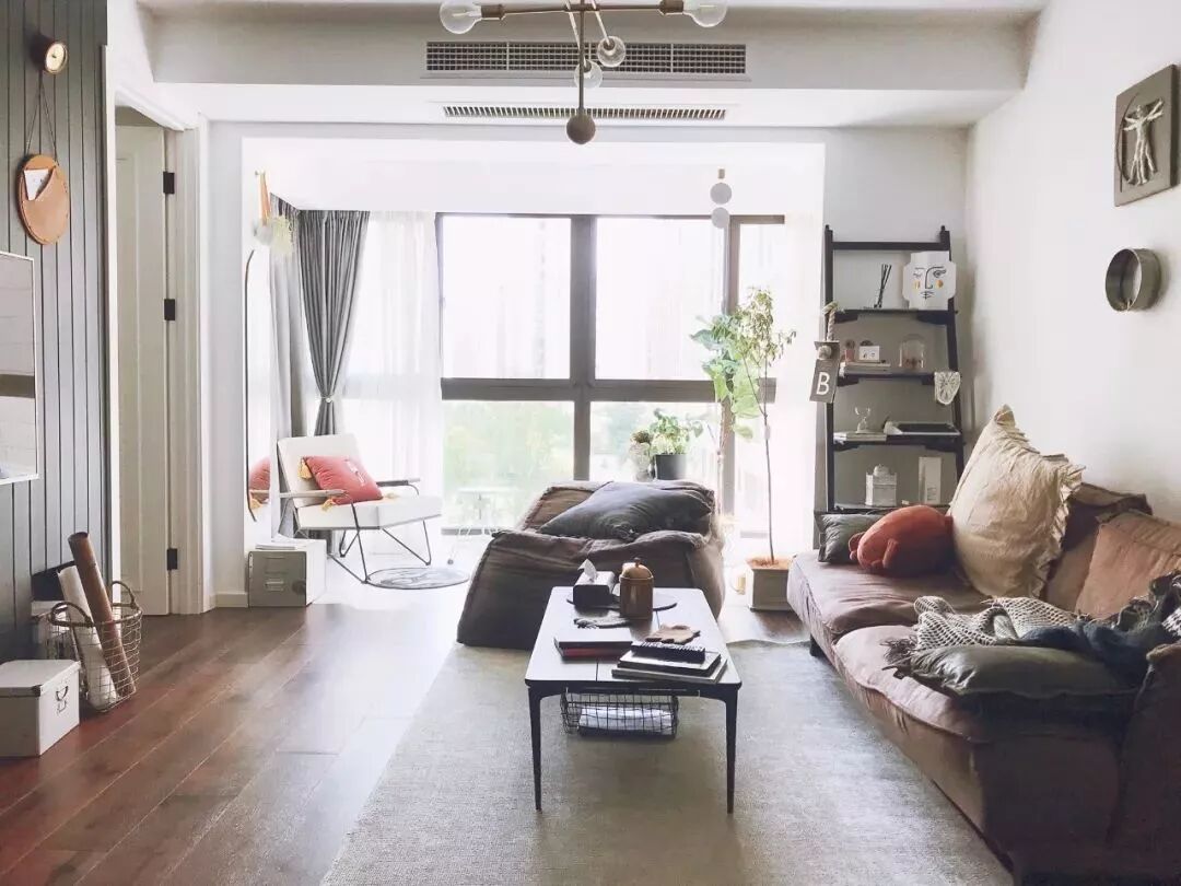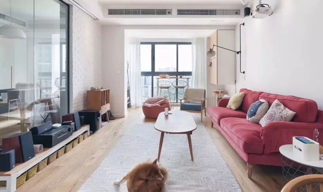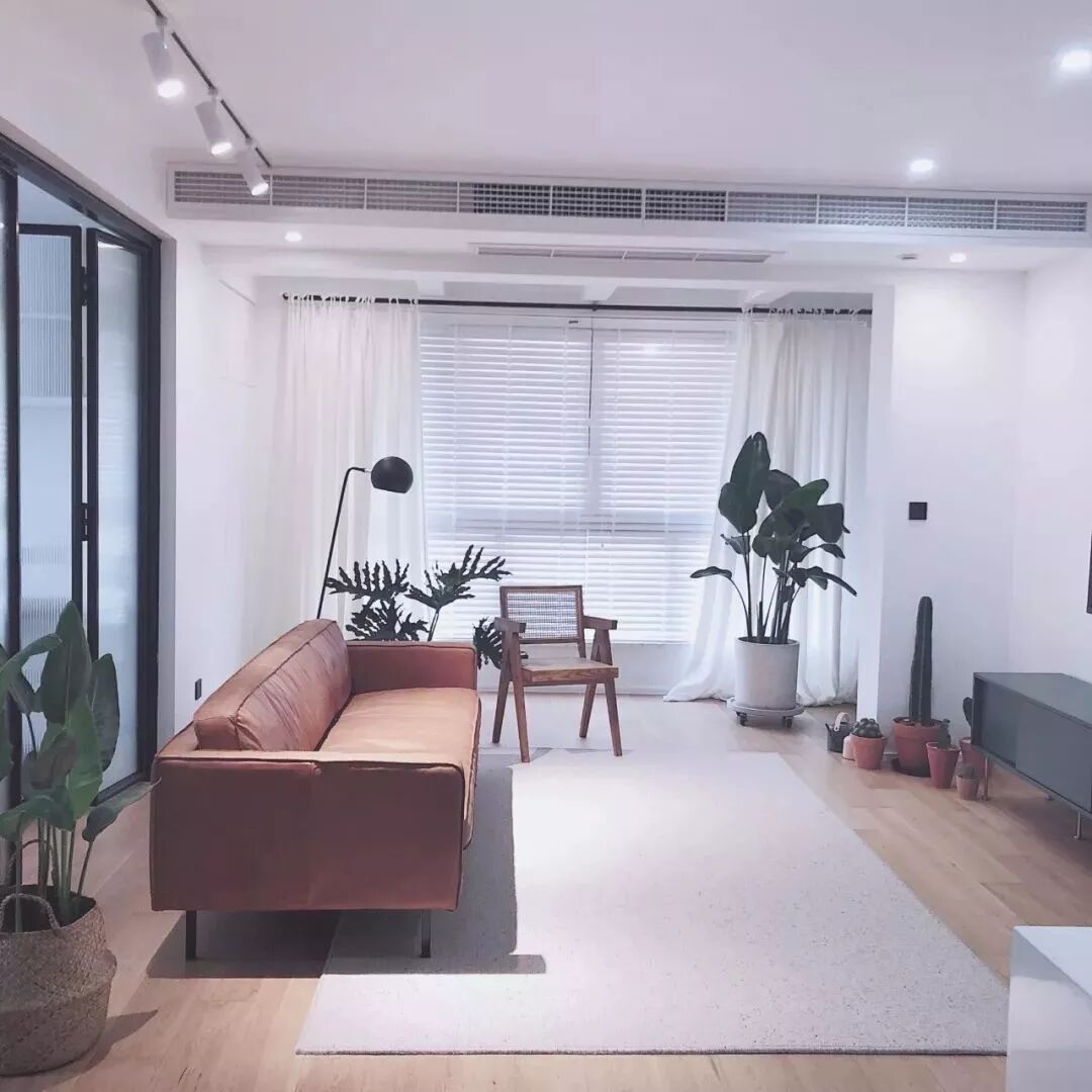 //一、内机装在沙发墙上方//中央空调一般是下回风的,所以装在沙发上方的话,会是一种较为舒服的选择,这样出风口是对着电视墙一侧吹,给人以有凉感无风感的体验。
