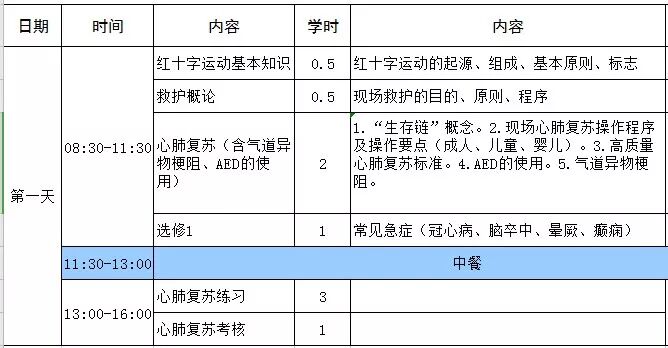 培训内容和课时:止血、包扎、固定、搬运四大创伤技术、心肺复苏技术,常见急症,现场急救及灾害事故逃生避险等,理论和操作考核,共计16课时。