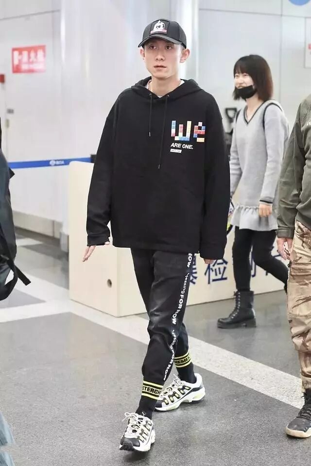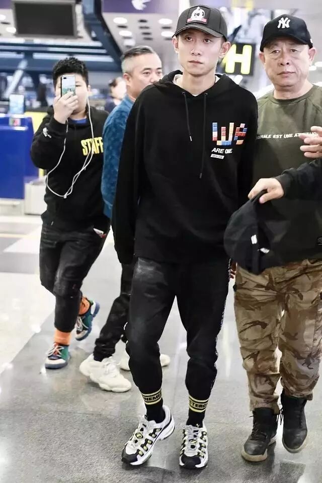 再看张一山还是走属于自己的痞帅风格路线,黑色连帽卫衣搭配黑色牛仔裤,一套休闲装穿得像大佬。特别是把裤脚直接塞进长筒袜的操作,让精瘦小细腿看起来更酷了。