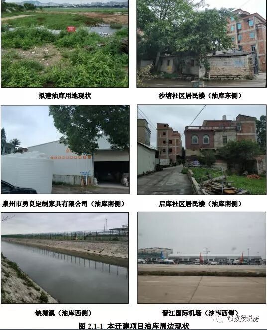本次迁建的新机场油库位于晋江国际机场东南侧,沙塘社区西侧(机场外), 距离机场跑道中心线305.3米,场地位置属于沙塘社区和后库社区。本次迁建的新航空加油站位于机场航站楼北侧259.8米(机场飞行区内),其南侧为机坪及滑行道,西侧为机场货运区,东侧为在建的北机坪保障用房及车库。库站间输油管线顺着机场的巡场路,沿线西侧为机场,东侧为沙塘社区、桂林社区。