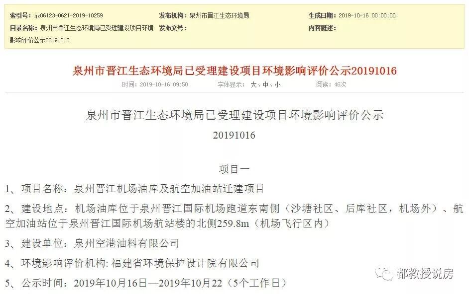 10月16日,晋江生态环境局公示《泉州晋江机场油库及航空加油站迁建项目》。