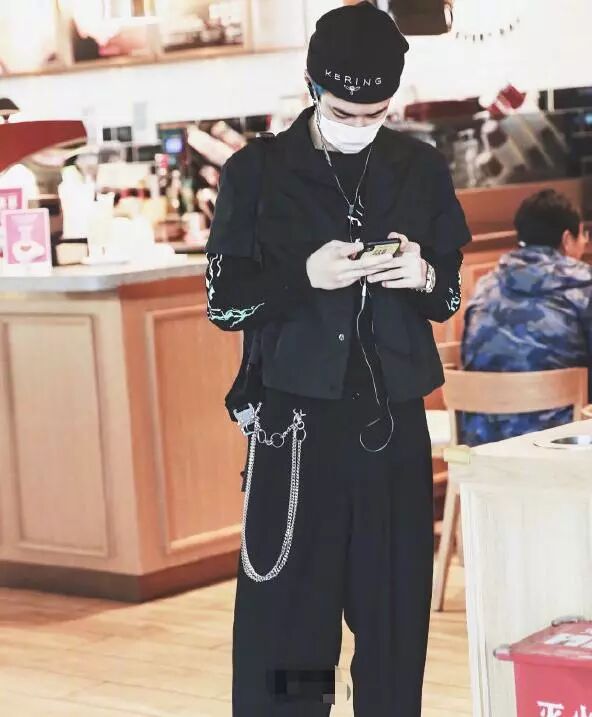 一身黑色的搭配是很多小伙伴都比较喜欢的,不仅仅在女生中可以看到一身黑色的搭配来显瘦,在男生中也有不少的人都喜欢选择一身黑色,这次他在私服中同样是选择了一身的黑色衣服搭配,里面是一件黑色的卫衣,衣服上设计了白色的条纹,让造型看上去可以更多元化很多,在外面搭配了一件纯黑色的短款衬衫作为外套,让整个造型的层次感更加鲜明,下面的是直接搭配了一件宽松的裤子,裤子的设计相对比较简单,不过在一侧设计了链子的元素,让整个造型看上去都更个性,嘻哈了很多。