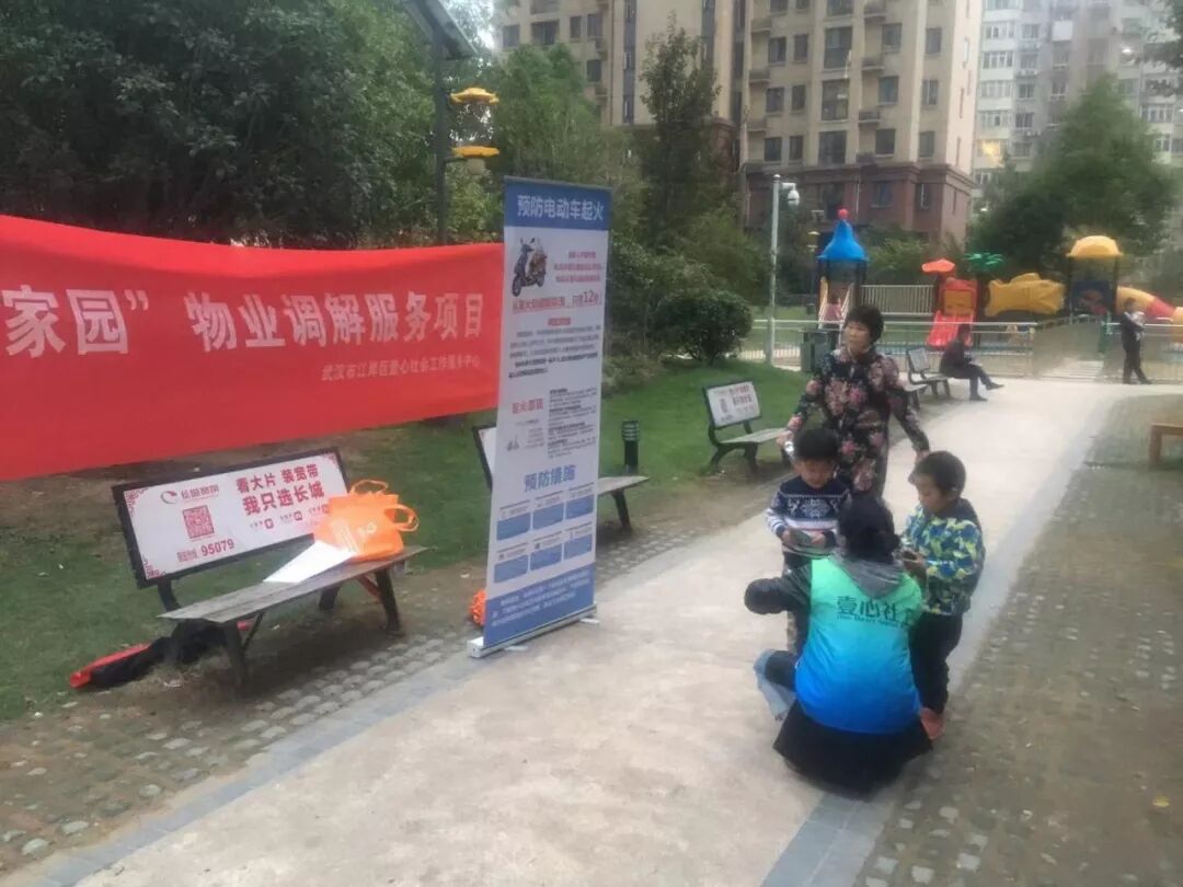 活动中,社工通过宣传册和知识问答的方式,为居民们讲解了物业管理背后的法律知识,普及了物业服务的主要内容、物业服务企业与业主委员会的关系、物业纠纷的解决途径等相关知识,现场业主及居民也对近期园区内出现的不文明行为展开了讨论,都希望物业工作人员对不文明养犬、电动车充电不规范等行为加强劝诫并采取有效管理措施,保障整个园区的公共环境,促进居民和谐共处。对此类情况,社工提出相关管理方法的建议,并借此就电动车不规范充电存在的隐患、武汉市文明养犬相关规范进行了详细讲解。