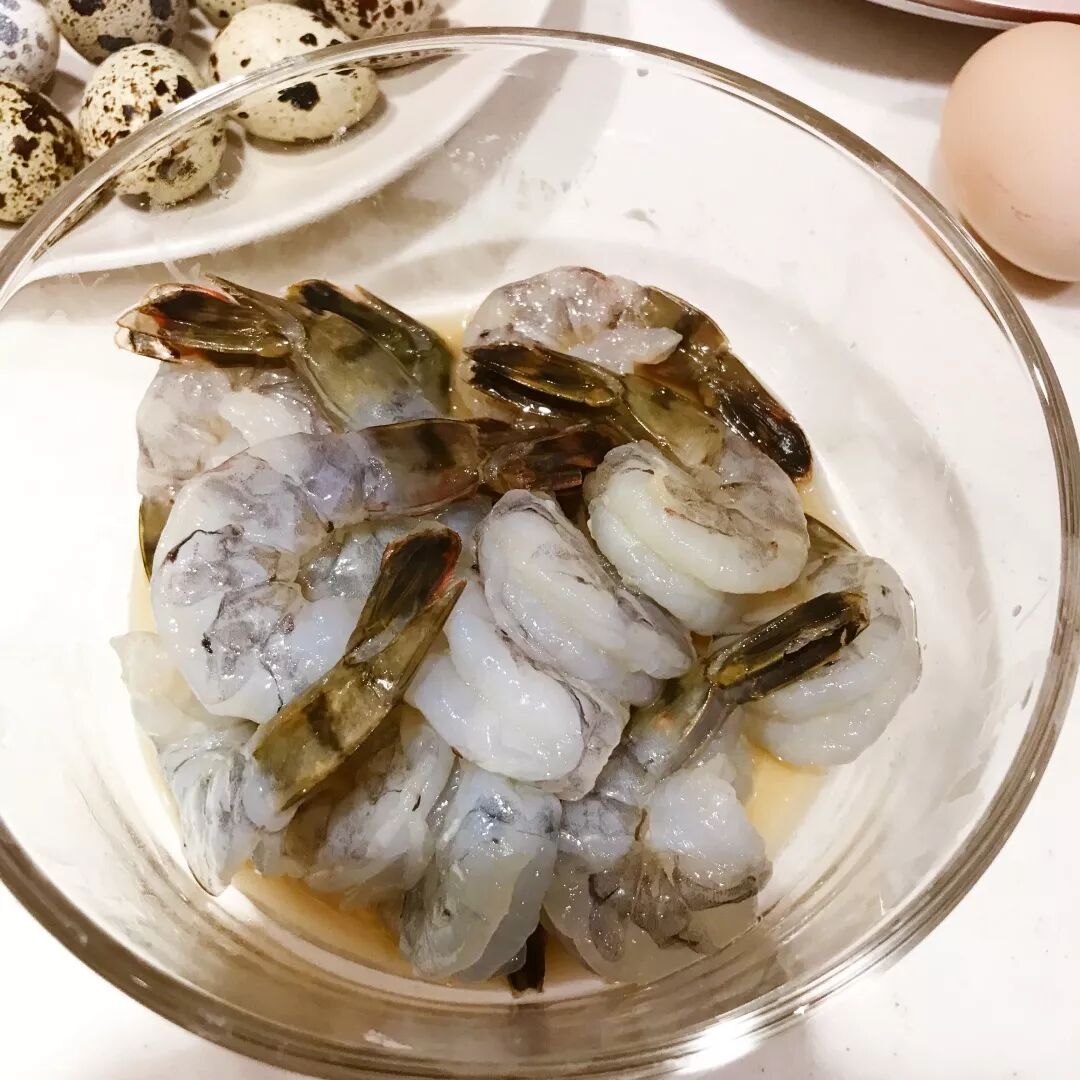 需要的食材很简单,去壳的鲜虾(保留虾尾)和鹌鹑蛋适量,鸡蛋两个,面粉50g。