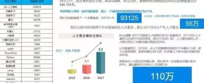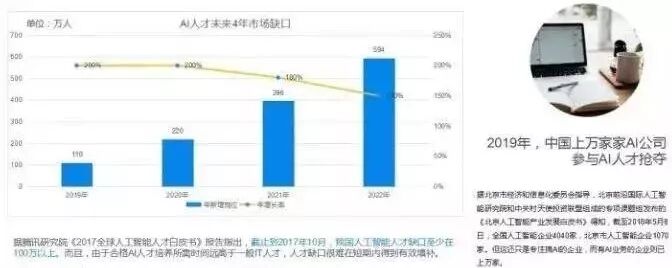 然而,根据人才市场报告,2019年AI技术人才缺口为110万。