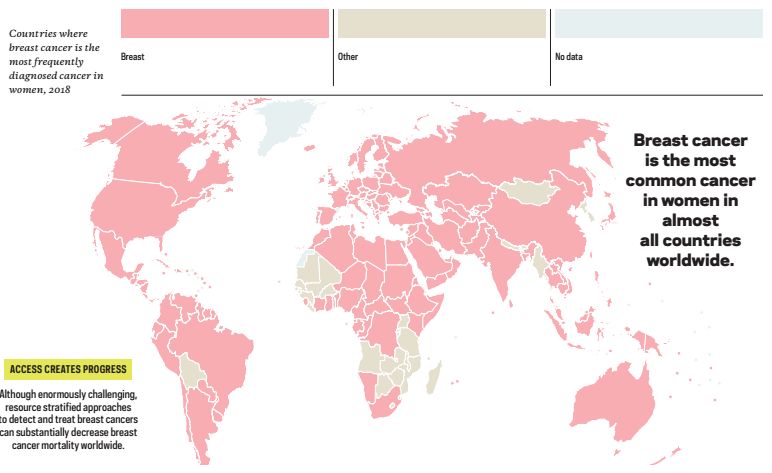 图10:女性最常被诊断为乳腺癌的国家 高收入国家女性在一生中患上乳腺癌的风险是低收入国家妇女的3倍。然而,在高收入国家,如果将母乳喂养时间从目前的持续时间增加到每名儿童12个月,在低收入和中等收入国家延长到2年,每年可避免22,000例乳腺癌死亡病例。