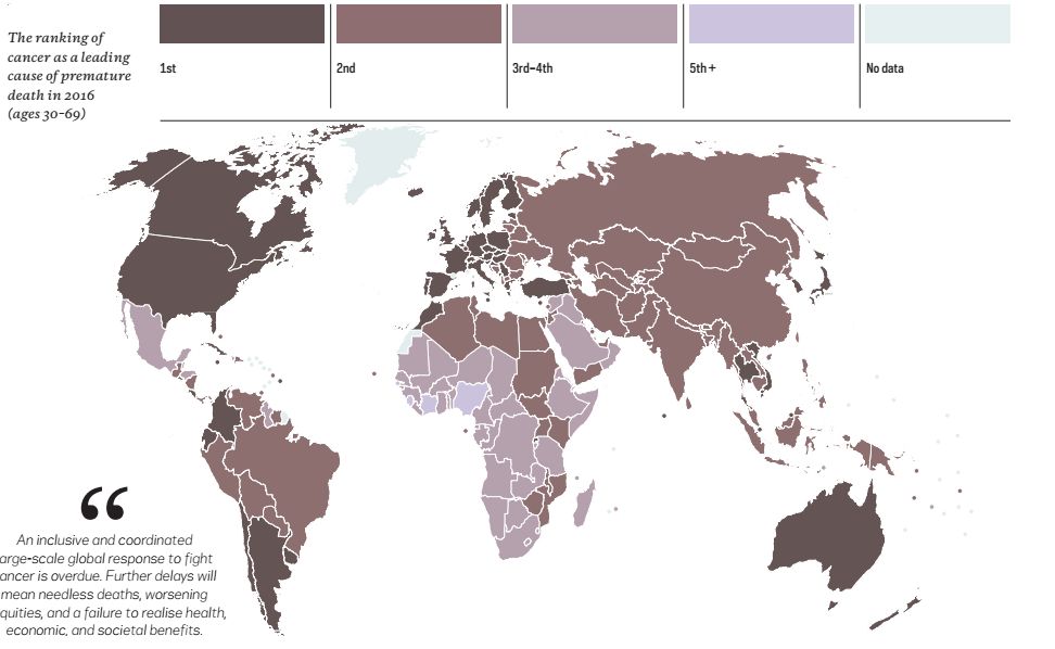在过去的几十年里,癌症已经成为全球人口死亡的主要原因。就早亡(定义为在30岁至69岁之间死亡)而言,2016年,癌症是55个国家(大部分为高收入国家)人口死亡的主要原因,是另外79个国家人口死亡的次要原因(主要原因是心血管疾病),如图3所示。由于预防和治疗策略的高度成功,许多国家人口的心血管疾病死亡率下降,癌症将成为本世纪人口预期寿命增加的主要障碍。
