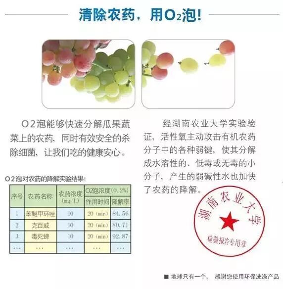 使用 O2 泡还可以清洗水果蔬菜,并且获得了农业大学的检测资质。