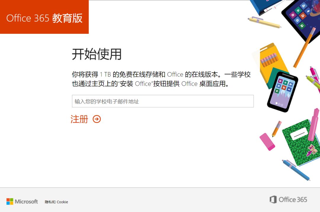 打开Office365教育版注册页面,输入你获取的教育邮箱地址,点击注册,然后按照操作要求填写相关的注册信息。