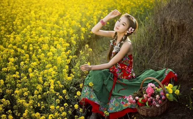 前景花儿明艳,后景人儿恬静美丽。