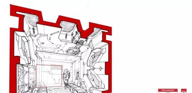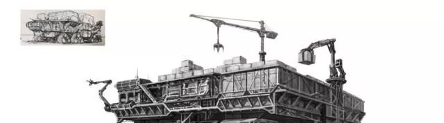 地下城电梯内景,这样一个不足20平米的小空间则是整个概念设计的起点,它属于延展到地面行星发动机的一个小细节设计,是连接地下城封闭空间和地面行星发动机开放空间的纽带,是整个影片空间逻辑建立的重要枢纽。另外这个小设计,功能清晰,适于探索视觉风格。