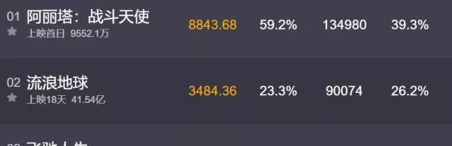 《阿丽塔》上映首日就把《流浪地球》的单日榜首挤了下来,差不多是二倍的票房。这也让《流浪地球》超越《战狼2》的目标难度更大。