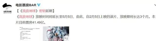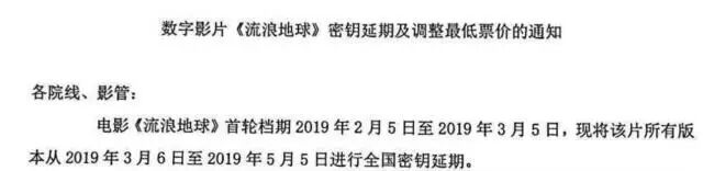 就在这时,一个队《流浪地球》有利的消息传了出来。消息称,《流浪地球》的影院密钥延期,放映时间将延期至5月5日,也就是说,从2月5日上映算起,这部电影将上映3个月,从现在算起,也还有两个月的放映时间。