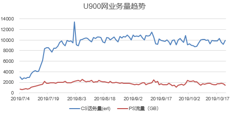 基站效能:通过U900/U2100共存区域的4G基站回落方式的调整优化,盲点区域压抑的语音业务通过U900网络得以有效释放,3G话务量呈稳定增长趋势: