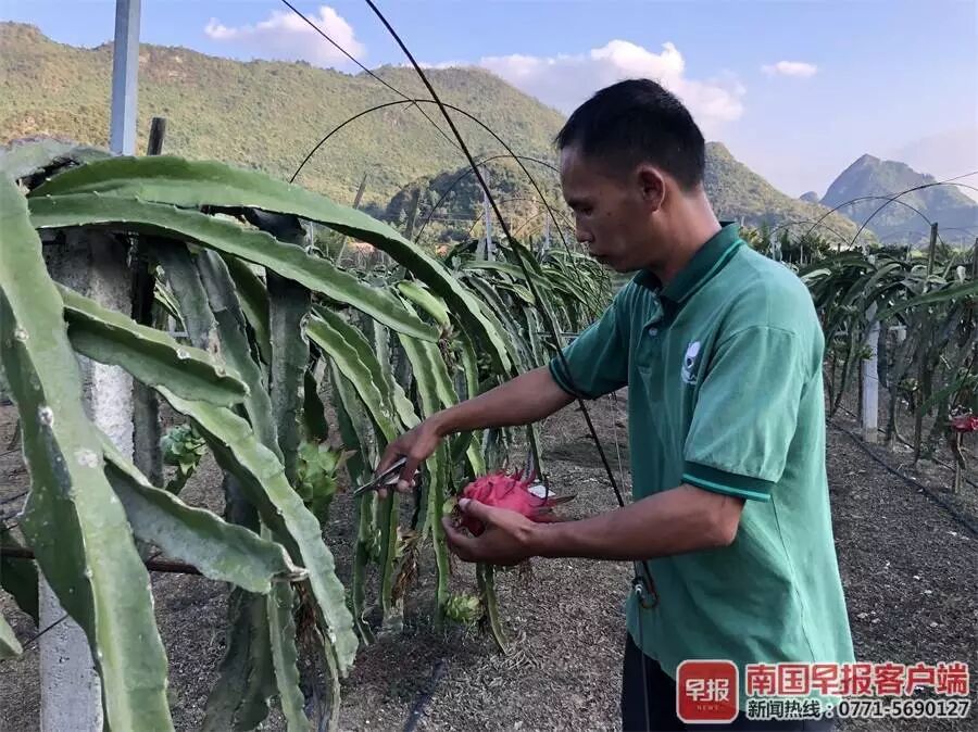 ▲宜州区三岔镇发展火龙果产业,韦宏万在火龙果园剪枝。