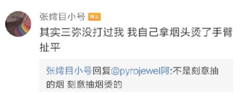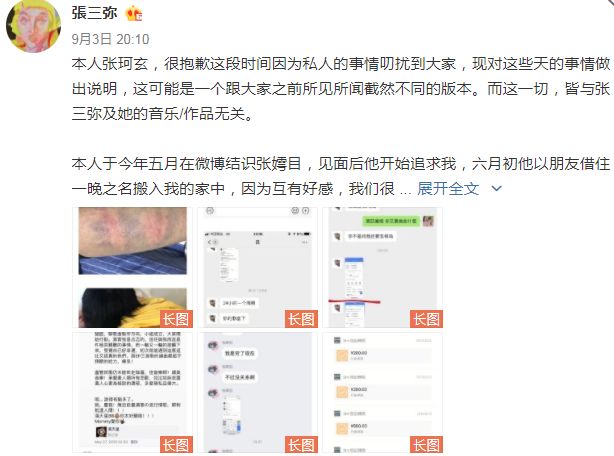 九月初,音乐人张三弥发微博控诉男友张嫮目的“七宗罪”——家暴、侵犯隐私、恐吓威胁、言语羞辱诽谤、出卖隐私,损坏私人财物,强迫发生关系。