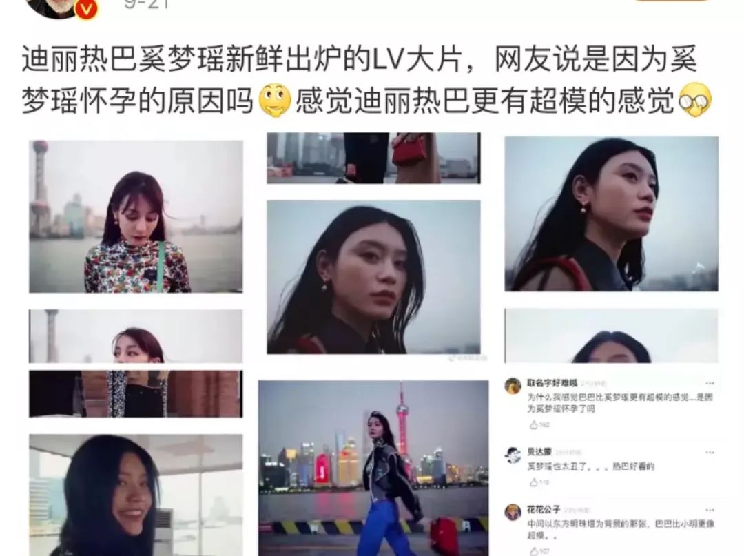 9月底刚发出的这组照片,和迪丽热巴一起为LV拍摄最新广告,当时状态乍一看一点也不像孕妇。