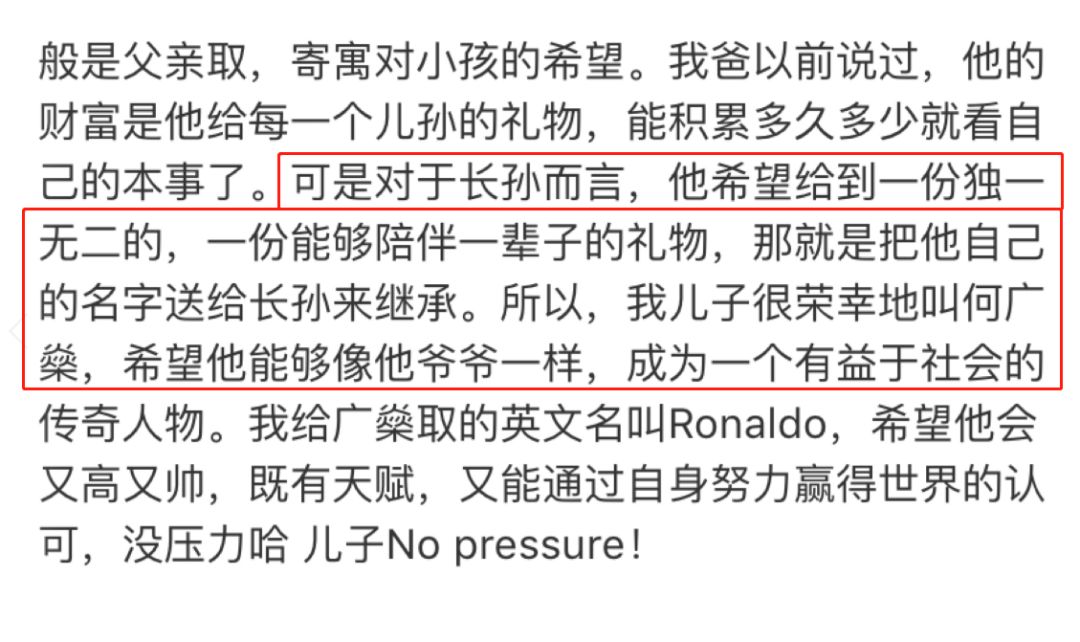 “那就是把他自己的名字送给长孙来继承。所以,我儿子很荣幸地叫何广燊,希望他能够像他爷爷一样,成为一个有益于社会的传奇人物。”