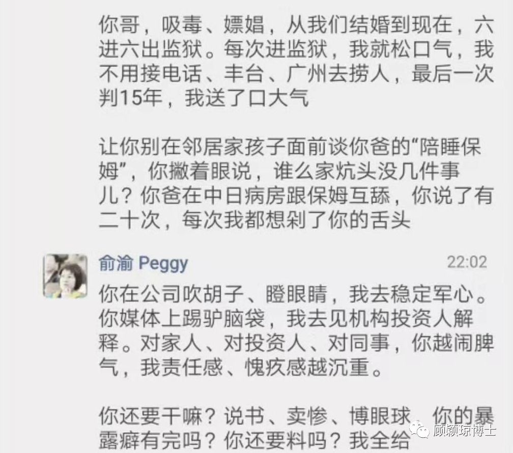顾颖琼博士说天下点击左上角关注顾博士 顾颖琼博士友情提醒:李国庆北大毕业,美国上市公司总裁,老婆俞渝北京外国语学院英语专业,在纽约大学读了MBA,好歹都算一对知识分子,离个婚,还要如此撕逼。