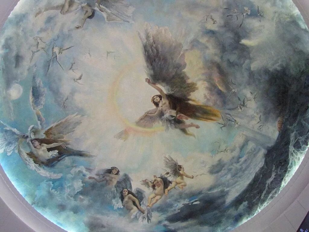 后来计划更改,请来画家秦征和他的几位学生,用四个月的时间,在穹顶上画了一幅名为《精卫填海》的油画。