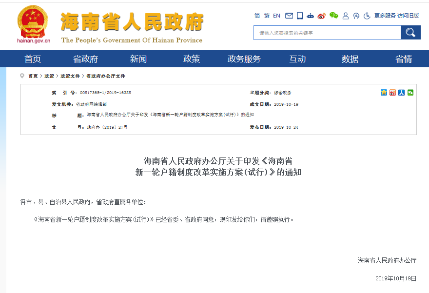 10月24日,海南省人民政府办公厅网站发布关于印发《海南省新一轮户籍制度改革实施方案(试行)》的通知。