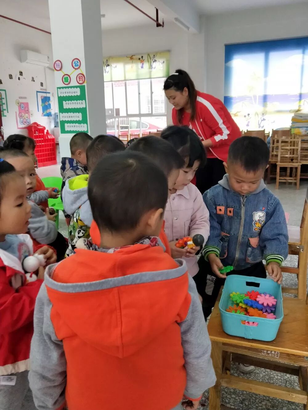 第二天7:30老师们早早的来到,将送给孩子们的器械、布置环创用的材料卸下车。