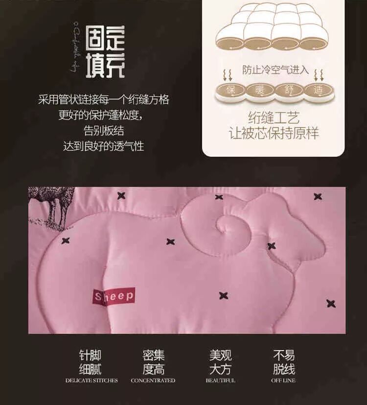 被面精美绗缝,形成独立的空间,有效防止跑毛、板结。
