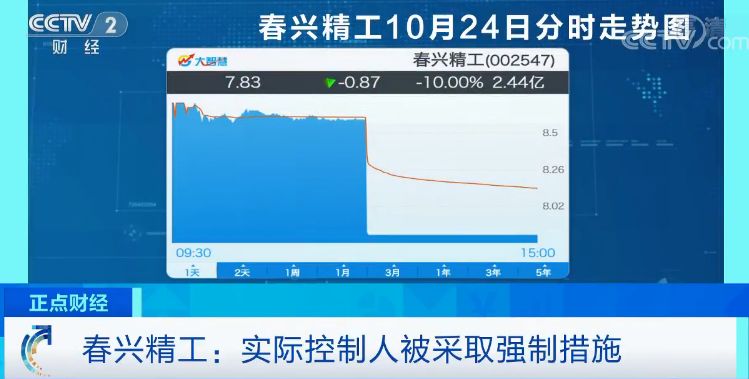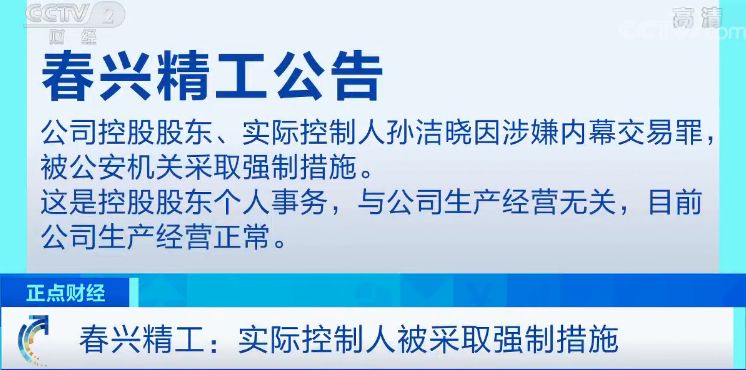 10月24日中午11点40分左右,春兴精工突然发出一条公告:公司控股股东、实际控制人孙洁晓因涉嫌内幕交易罪,被公安机关采取强制措施。公告强调:这是控股股东个人事务,与公司生产经营无关,目前公司生产经营正常。