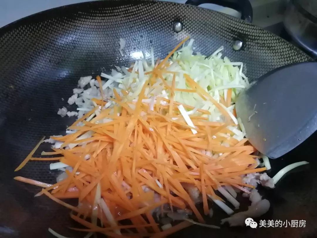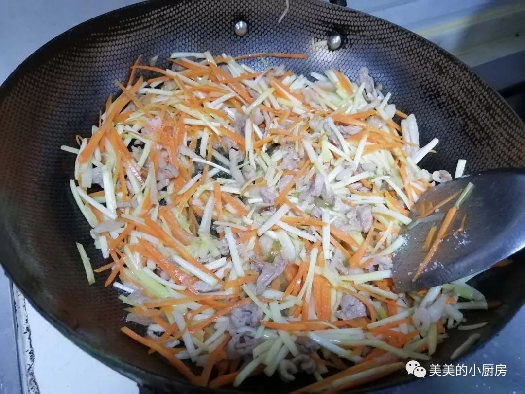 8,然后加入炒好的肉丝胡萝卜韭黄线,然后包起来了即可。