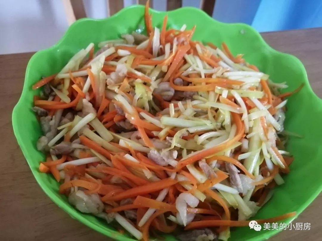 主要食材:猪肉100克、韭黄100克、胡萝卜100克,油少许、盐少许。
