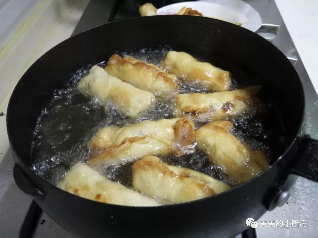 10,煎锅里放半锅油,放入包好的春卷,一锅炸八九个左右。