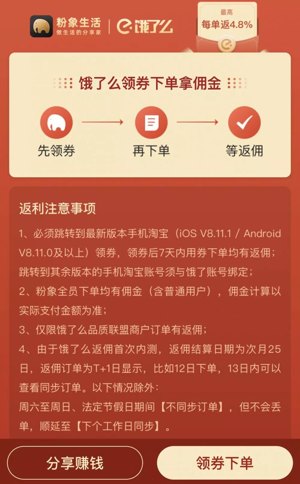 如何在粉象进行饿了么领券下单返现?