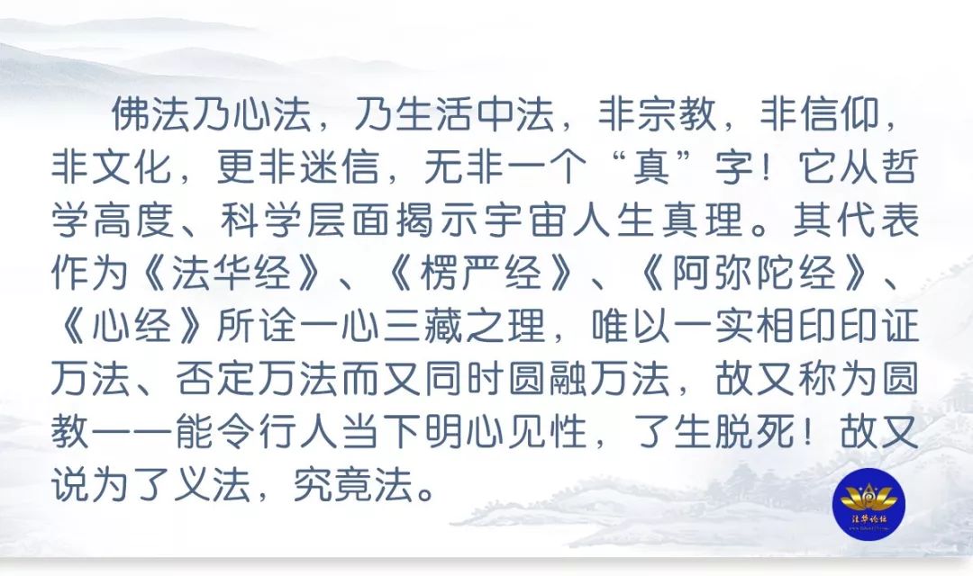 自古“成佛的法华,开悟的楞严”,《法华论坛》是大力广宣并讲解《大乘妙法莲华经》、《大佛顶首楞严经》的大型综合性佛教网站。网站致力于弘扬究竟了义的真理,成就中国特色的佛教,圆融佛法与天地万法包括哲学、科学、文化等领域于一体,为社会主义核心价值观强基固本,为共享共建人类命运共同体凝魂聚气。