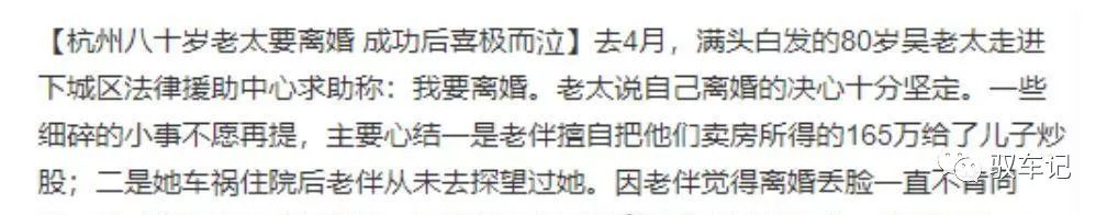 动静中的杭州老太太,非常大的心结就是老伴私行将他们卖房所得的165万给了儿子炒股。云云庞大金额的伉俪配合财富,老伴却毫无商议地本人决意了钱的意向,且不说非常后这笔钱被炒股浪费掉了,就单从这一行为上来看,在通常生存中,他们想必也历来没有好好谈过钱,没有商议过一笔钱的花销。如许的两片面生存在一路,肯定会由于钱的题目,辩论接续,而这165万就成为了压服骆驼的非常后一根稻草。有一句话说,哪有甚么从天而降的心死,但是是积聚了太久的冲突和委曲。