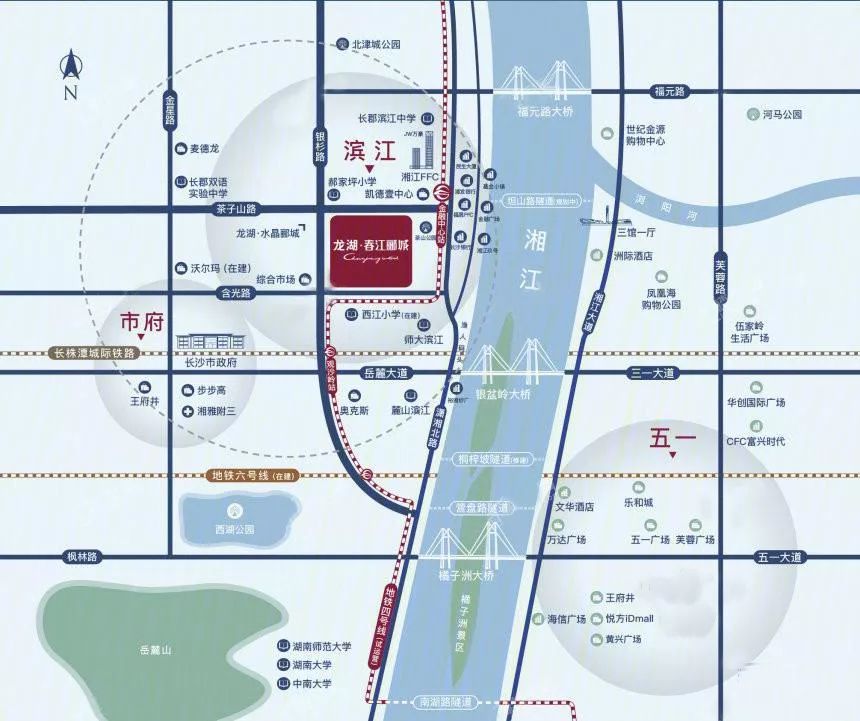龙湖春江郦城位于长沙市岳麓区银杉路与茶子山路交汇处东南角,择址滨江最后一块珍稀之地,占据滨江最中心——金融中轴线上,毗邻地铁4号线、6号线(在建)、10号线(规划)。