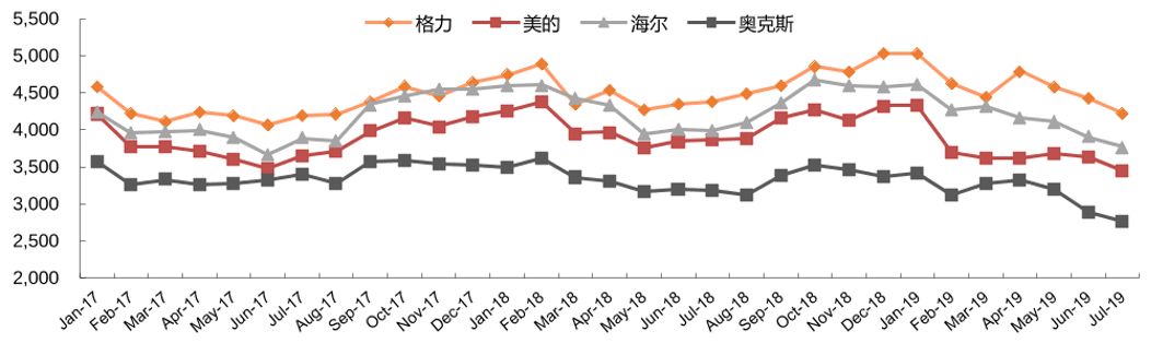 04龙头价值变现之二:下游市场定价灵活在消费端,格力的价格又高于对手。根据中怡康的数据,国内市场份额前四的品牌中,格力的均价显著高于对手,甚至是奥克斯的一倍以上。而即便是在高端的定位上,格力空调从量的角度计算市占率,无论出货还是零售,均稳坐第一。图:不同品牌空调零售均价