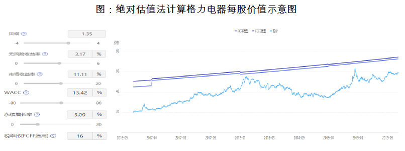 考虑到增值税下调,汇率以及成本控制,利润增速应该略高于营收增速。然而,如果仅从相对估值上看,格力19年约13倍PE的估值水平的确高于业绩增速,而这部分估值溢价应该是市场给予格力的确定性溢价,以及对于混改后的乐观预期。在行业企稳的环境下,格力历史上ROE保持在20%以上,而派息年份股息率均处于行业领先。基于5%的永续增长率等参数,萝卜投资采用股权/企业现金流折现方法计算的绝对估值显示,格力目前价格相对于绝对价值仍有可投资的空间。