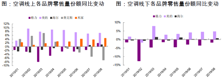 但是价格和销量之间绝非割裂。在价格上的操作空间可以在份额上获得掌控力。在今年上半年,奥克斯线上的低价网批,以及美的的补贴促销,一度抢占了格力在空调市场的份额。然而下半年格力终端提升促销力度后,份额下降立即得到了扭转并于8月开始回升。