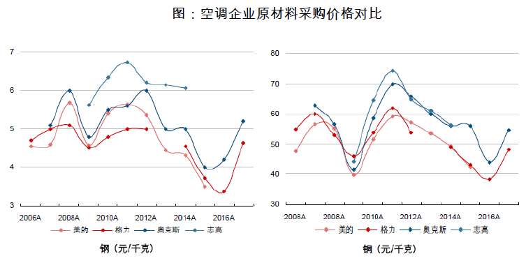 03龙头价值变现之一:上游采购具有成本优势早期的格力正因凭借压缩机领域的核心技术,在产品端获得了极强的认同,并通过渠道的经营和自身产品的更新维护住了市场蛋糕,不断强化自身的规模优势,并变成可以量化的价值。例如,格力在原材料钢铜铝的采购价上比小规模的竞争对手低10%以上,按照成本比例推算,同样价格下毛利率贡献高出5%,而空调行业整体毛利率也就30%左右。再如,在增值税税率下调的政策中,格力对上游原材料环节价格让渡,对下游保持议价权,从而把政策红利变成可量化的利润增厚。这样的良性循环让对手分走蛋糕的难度变的极大。